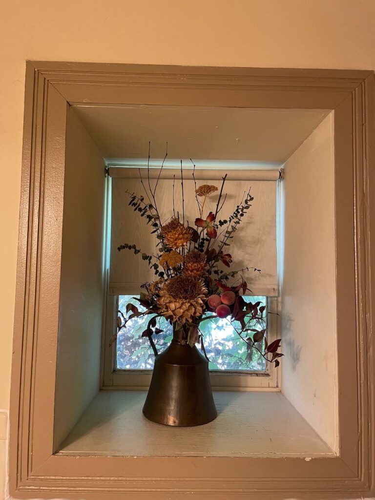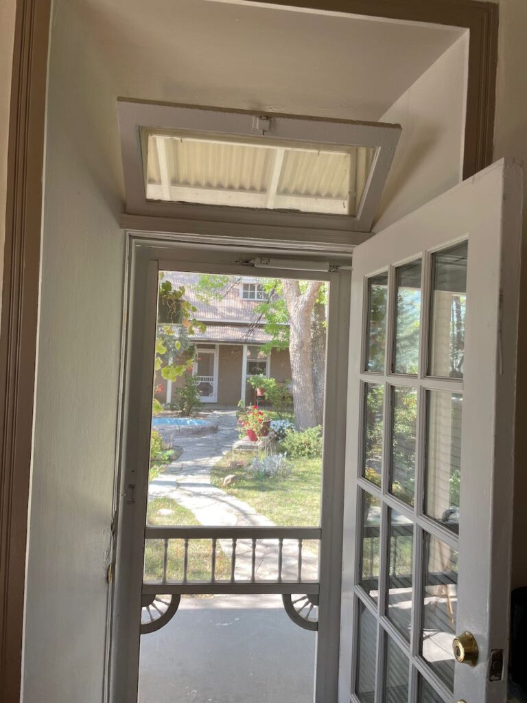 The walls of an adobe building are a foot or more thick. As a result, window sills are like deep shelves and doors are a distance from the interior side of the wall. Adobes give a hug from within.