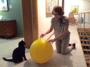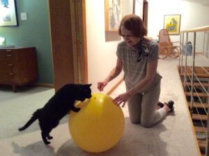Fear is a terrible emotion, often worse than the object or thing feared. I don’t want any creature to live in fear, especially one that lives in my own house. So I tried to devise a way to help Taj overcome his terror of a ball he could deflect with one good bat of his paw.