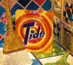 Her first major work was a life size reproduction of a suburban kitchen entirely covered in beads. This mind boggling project took five years (1991- 1996) to complete. Each of the millions of beads used was hand set with a tweezers.