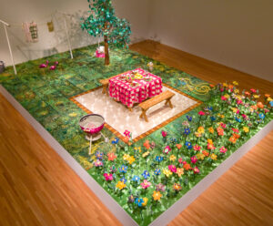 Her next project in 1996 was entitled “Backyard”. It features a picnic table laden with food, a lawn mower, garden hose, flowers and grass. For this work she used help: volunteers came to her studio on Saturdays and worked on the 250,000 blades of grass. Overall, 30 million beads were used.