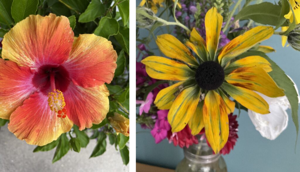 A tie between a sensational hibiscus spotted in a downtown Cedarburg flowerbox and my neighbor’s “painted” blossom