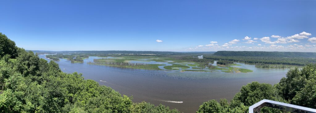 The Wisconsin River joining the Mississippi River viewed from Pikes Peak State Park in Iowa