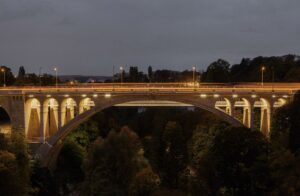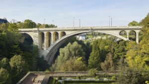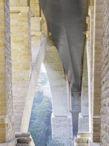 One of the most spectacular entrances to the town is the 1903 Pont Adolphe bridge, a 501 feet long stone structure and a beloved historic landmark. When cracks were discovered in the bridge in 1996, plans were made to stabilize and widen it. Great care was taken to retain the historic look of the bridge. As part of the restoration process, all the stones creating the arches were numbered, removed and taken away for cleaning. When the work was completed in 2016, the stones were put back in place like assembling a giant puzzle. The completed bridge has two one way traffic lanes and two tram lanes plus an award-winning new feature, bicycle and pedestrian lanes hung under the vehicular roadway.