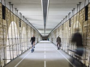 Since the bike path opened, riders and walkers have turned out en masse with great enthusiasm, too much enthusiasm, in fact. The Luxembourg Times reports that it is impossible to bike a straight line through the lanes. Too many riders are stopping to enjoy the incredible views framed by the arches. They can hardly be blamed.