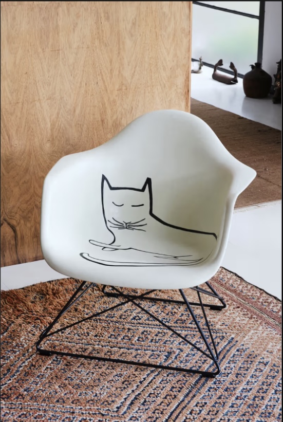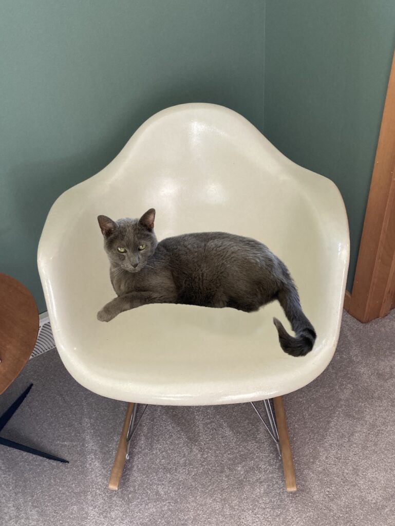 I may not have the funds for the feline chair, but I do have an Eames shell chair. And it is often embellished with a cat…a real one.
