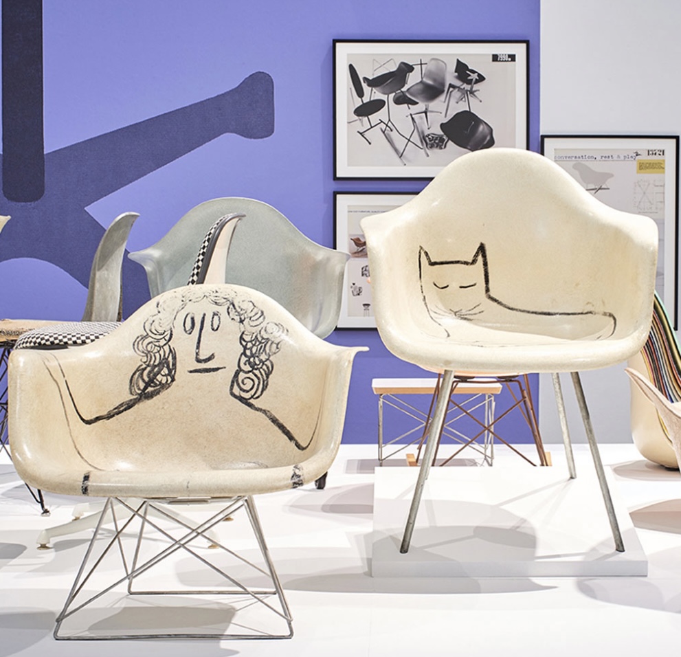 Shortly after the chair’s creation, Saul Steinberg, the witty artist best known for the 1,200 drawings he created for the New Yorker magazine, visited Ray and Charles in their Venice, California studio. In a playful moment, he grabbed a paintbrush and started painting his famous line drawings all over the walls, floors and furniture. The couple viewed this “vandalism” as good fun and documented the event with photographs.