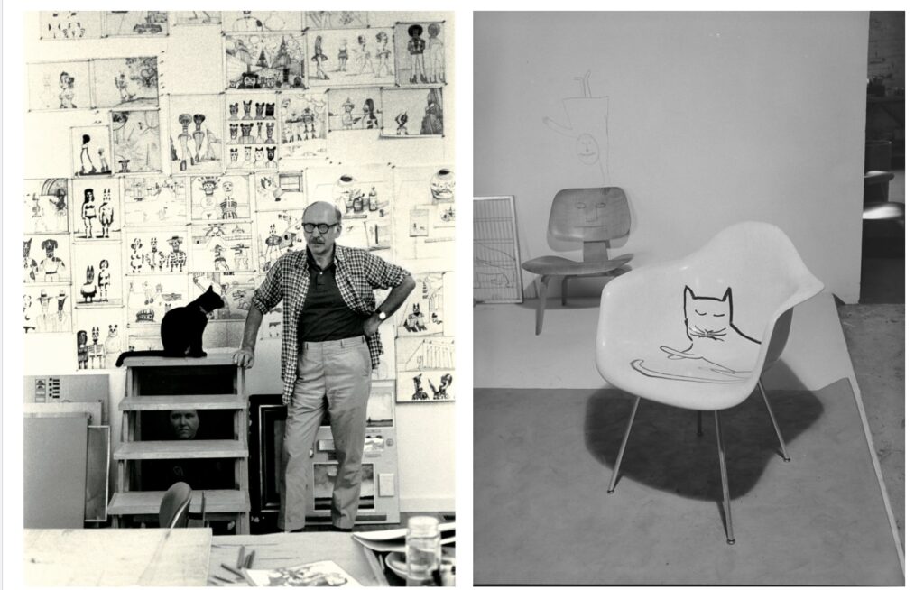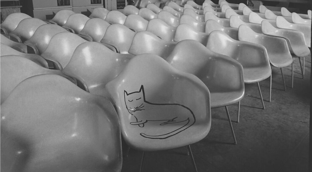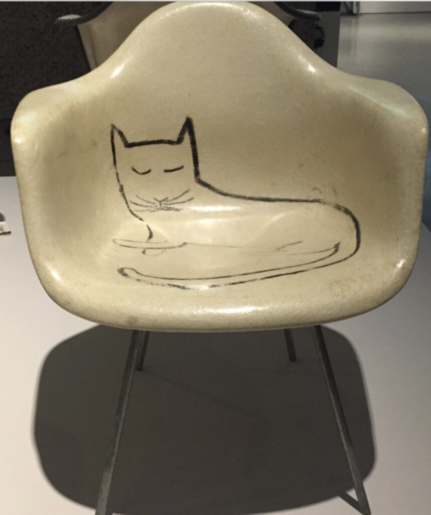 Cats were one of Steinberg’s favorite subjects, and he painted one resting in the newly created shell chair. Now, nearly three-quarters of a century later, furniture makers Herman Miller and Vitra are producing exact replicas of that whimsical chair.