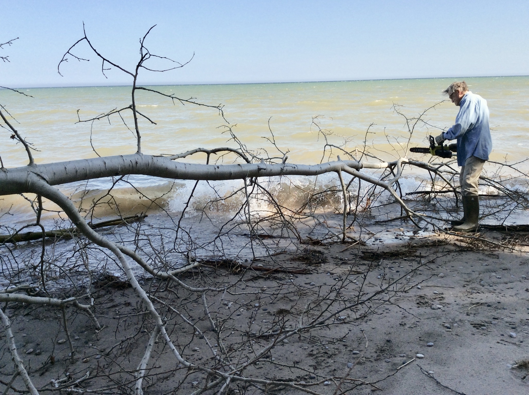 This year’s surprise was an April blizzard accompanied by 18 foot waves in the lake. Huge chunks of our cliff were washed out, and two mature trees toppled onto the shore. Furious sawing again allowed us to open up the beach.