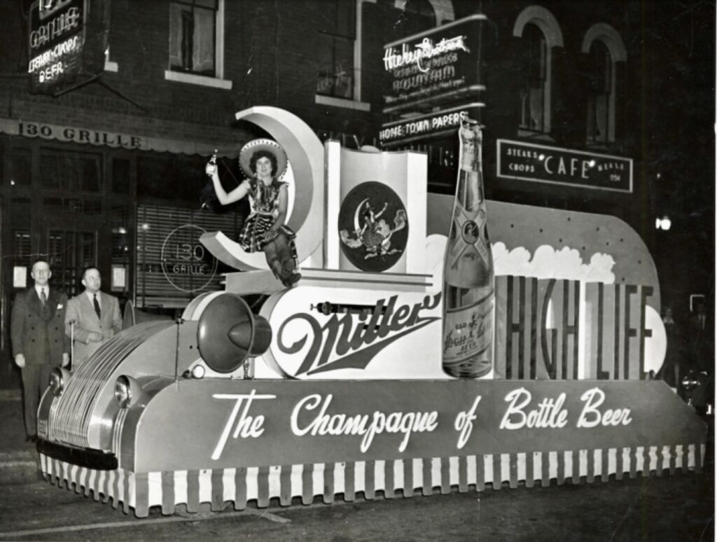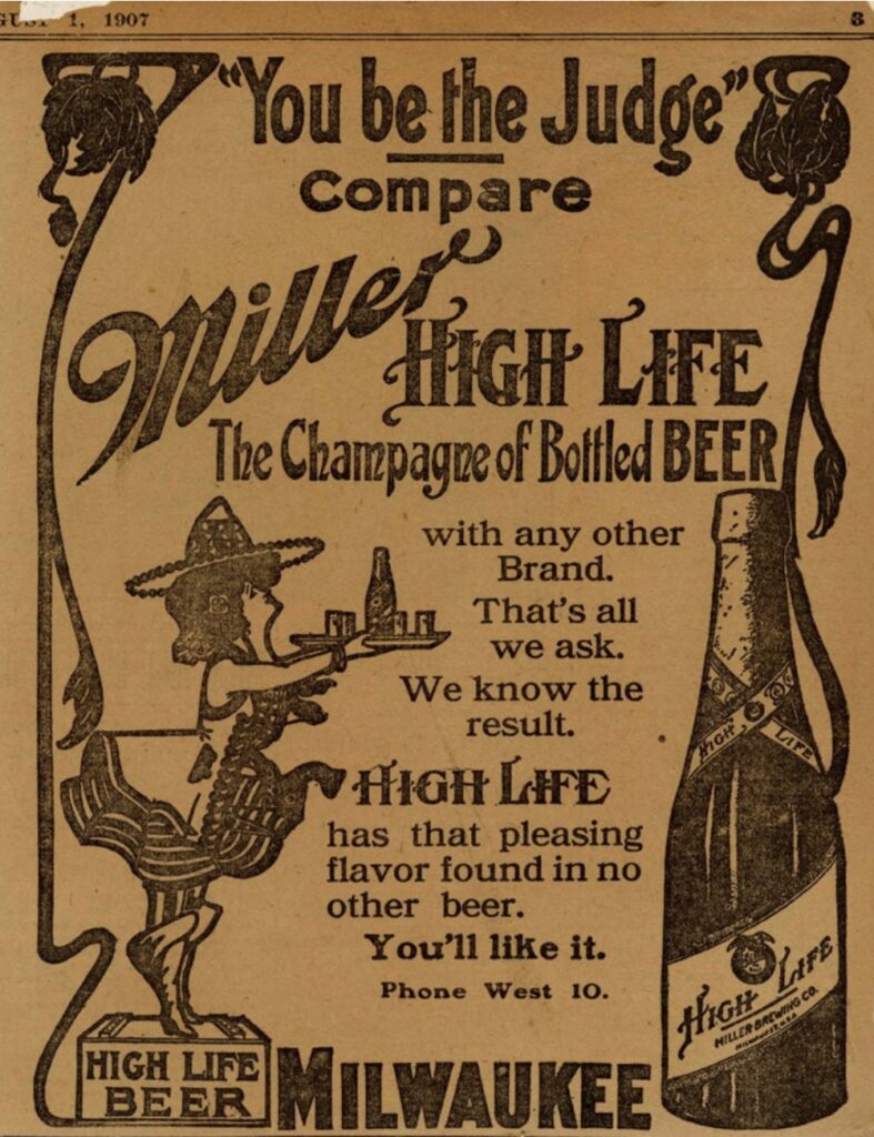 On New Year’s Eve, 1903, Miller debuted clear glass bottles to showcase his beer’s clarity. The bottles had long necks modeled after champagne bottles. In 1906, the company adopted the slogan, “The Champagne of Bottled Beer”. The nickname stuck to this day and is on every bottle or can. (The word “bottled” was dropped in 1969.)