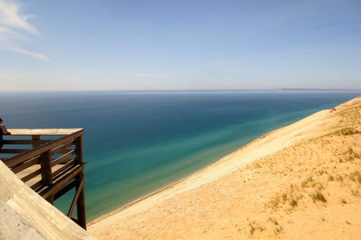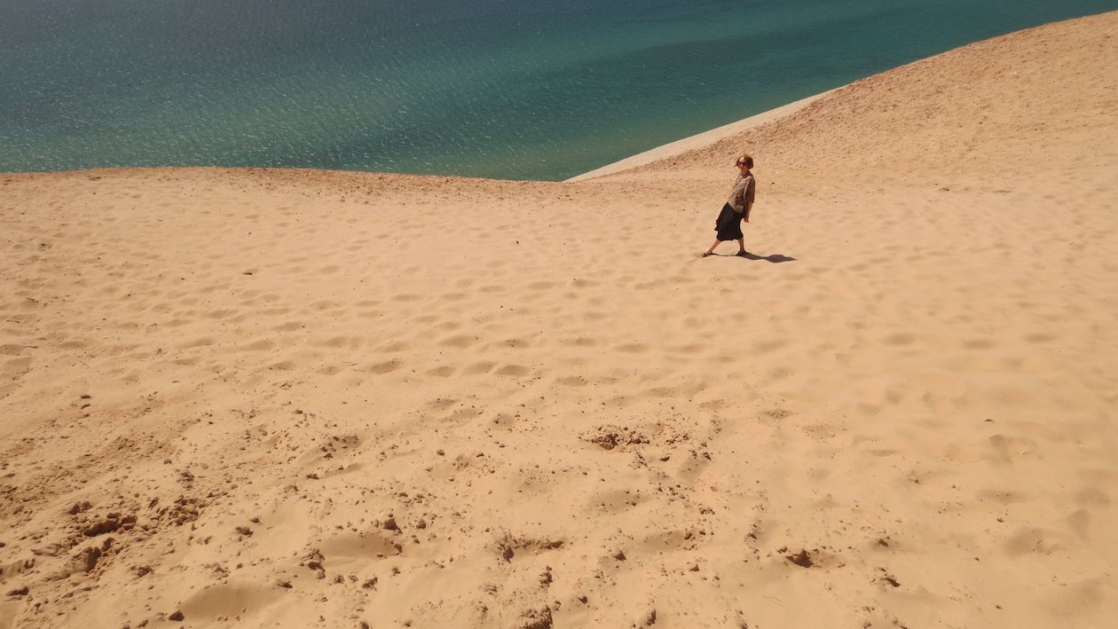 Fortunately, neither my husband nor I harbor any needs to conquer that sand mountain. We just soaked in the view from the observation deck above and played in the upper parts of the world’s tallest sandbox. We also laughed at this line from the park’s visitors guide: “Wisconsin is 54 miles due west, but thanks to the curvature of the earth, you will not see any cheeseheads waving back at you.”