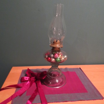Grandma put Christmas ornaments in the glass base of the lamp and then replaced the chimney. Those ornaments, put there by her hands, have remained ever since. The first ritual of our Christmas season is to unwrap the old lamp with great care and place it on the kitchen buffet where it is in constant view.