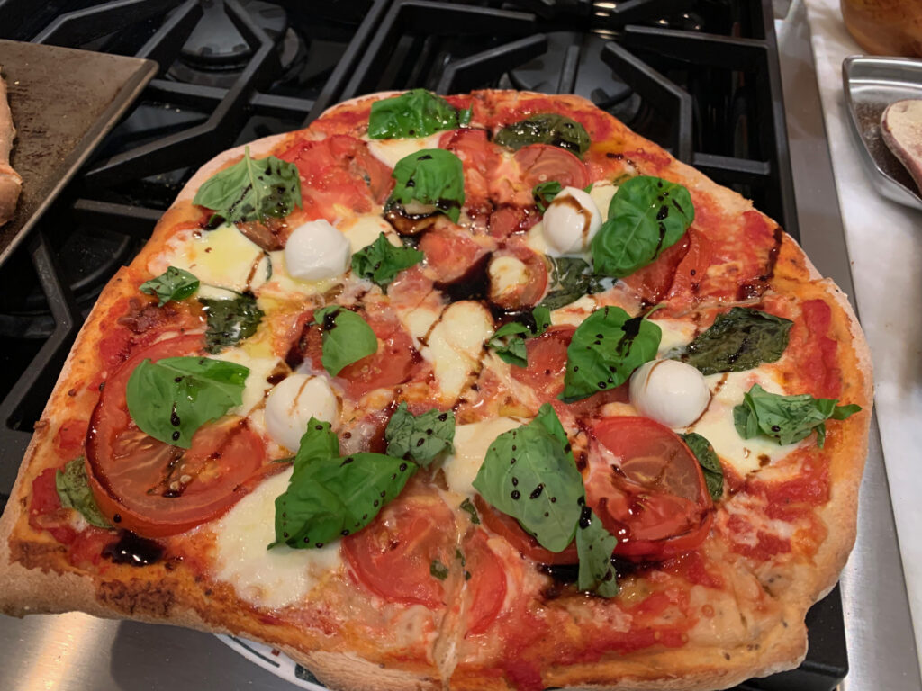 Like all pizza aficionados, we do have preferences. We both agree that the crust should be paper-thin and crisp; we don’t want a mouthful of dough to overwhelm the toppings. We also have a favorite pizza, the Margherita.