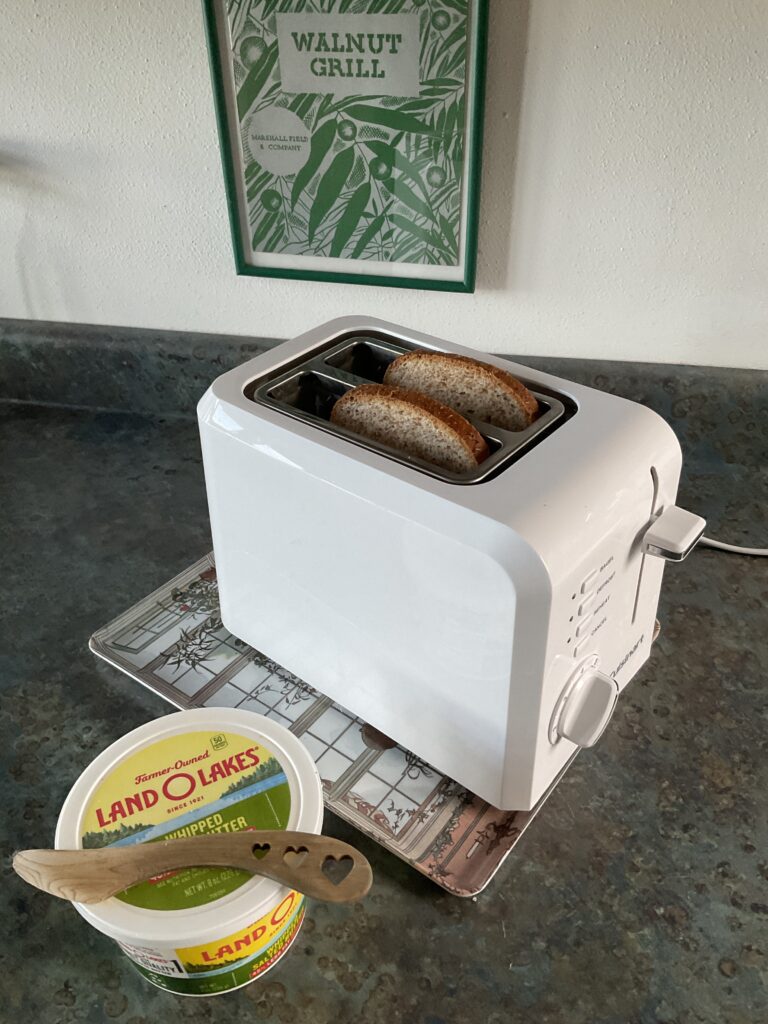 The other day I got lucky and turned into the bread aisle as the driver was stocking all the Arnold Bakery products. When I asked him about my favorite bread, he cheerfully said, “Oh, you mean the little red brick.” I laughed but was happy to find out where he stocked the most loaves.