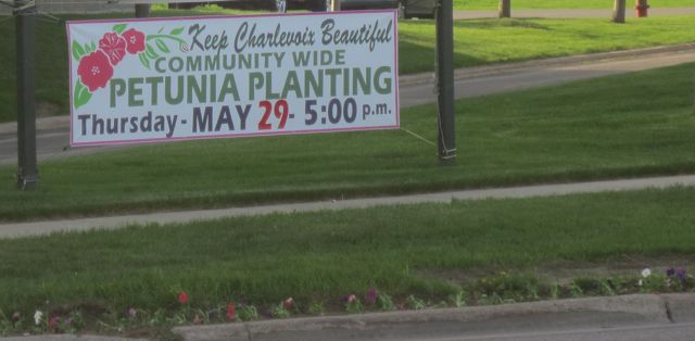 Last Thursday, May 29, 2014, we were heading into Charlevoix at 11:00 AM. When we hit the northern edge of town, NO PETUNIAS were in sight as in past years. There were cultivated beds with perfectly evenly spaced holes in them. The empty beds spanned the entire town.