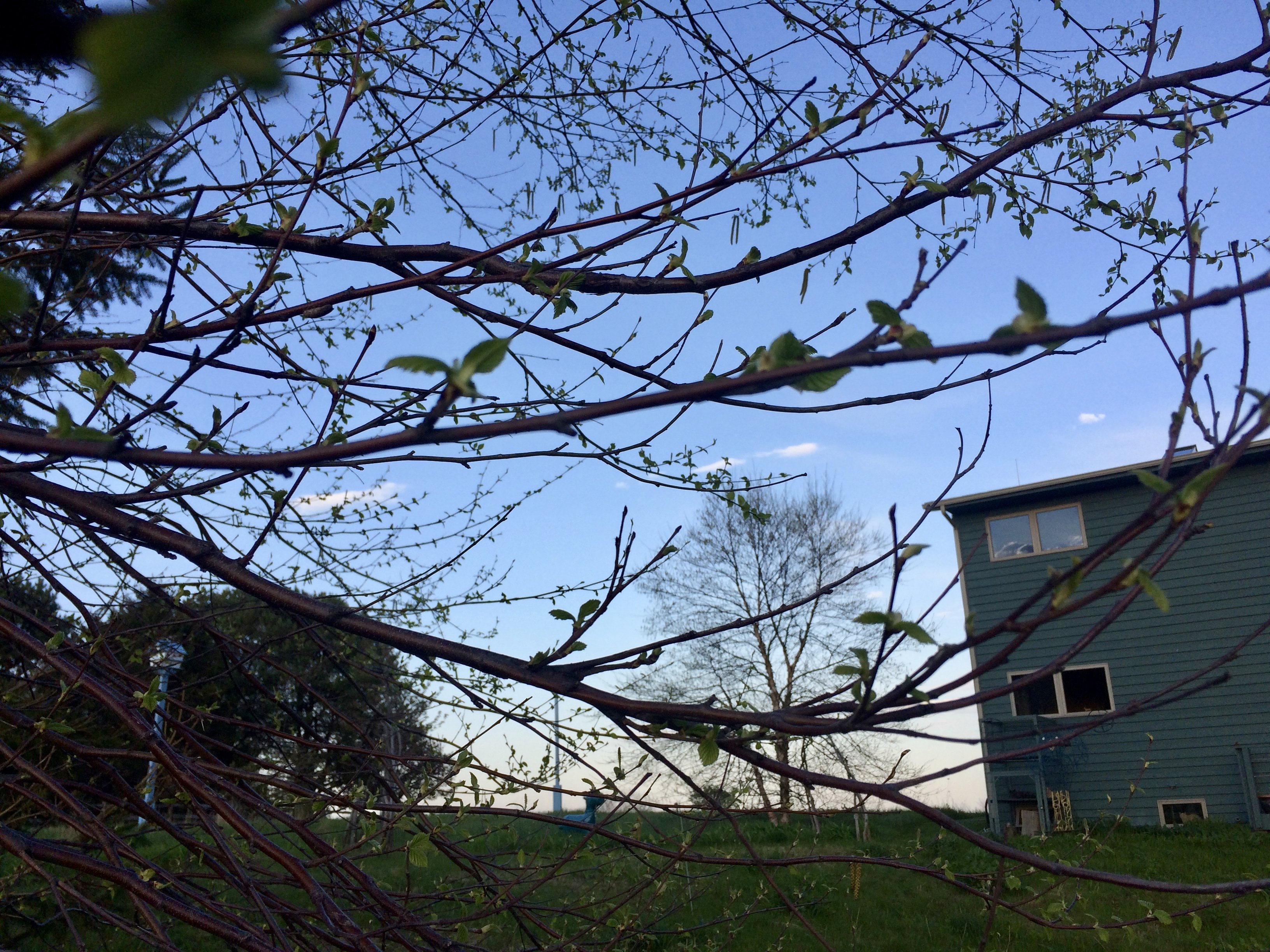 We are still waiting for the green leaves on our trees to fully open. When the first whisper of green appears on the trees, our spirits soar. This year that gauzy stage has lasted a long time, almost as if those tiny leaves tasted the air and decided to stay snuggled up in their buds until things improved. Our birch trees, always the last to leaf out, are more reluctant than ever to unfurl their greenery. Here is what they looked like last weekend.