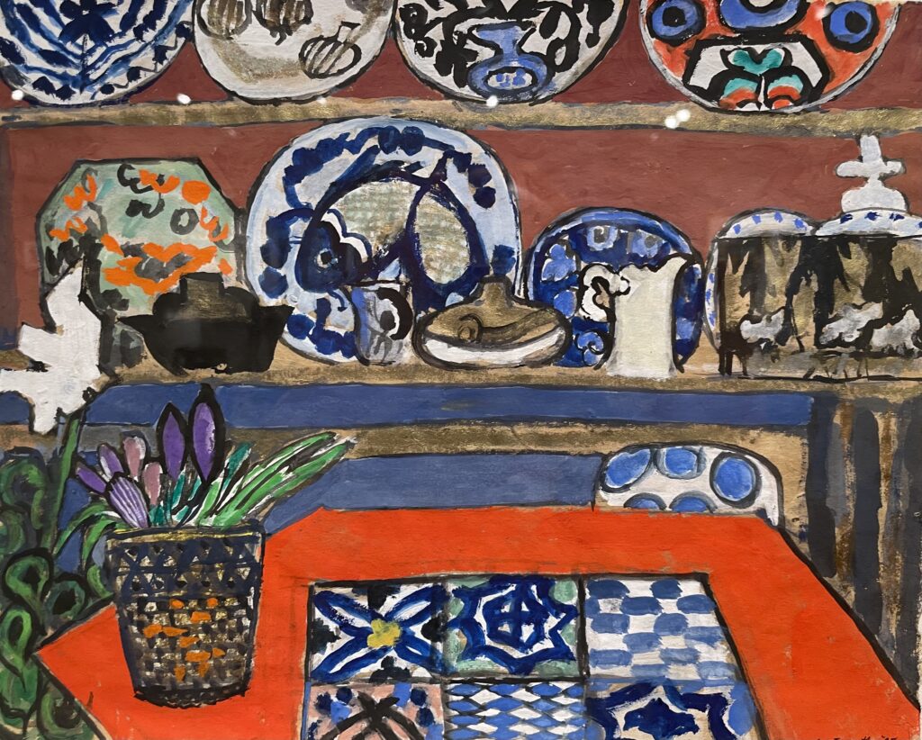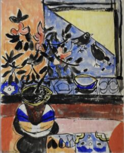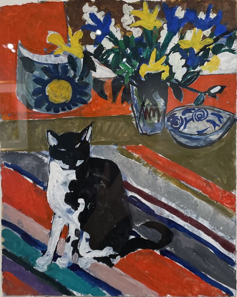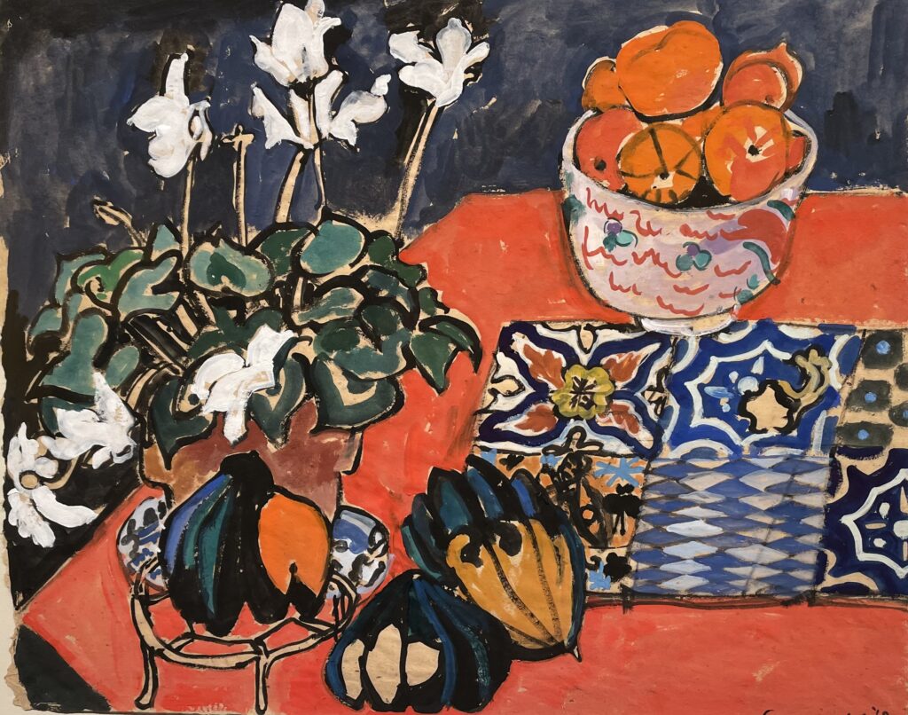Over the years, both artists developed unique styles and each worked in separate studios. Schomer’s dominant themes were cows and ballet dancers. Ruth’s art was greatly influenced by the Fauves and their vivid colors. She was especially intrigued by the work of Matisse. After frequent visits to Taliesen and conversations with Frank Lloyd Wright, Ruth became fascinated with the arts of Japan. Both she and her husband spent two months in Japan in the 1960s. That trip provided her with inspiration for the rest of her career.