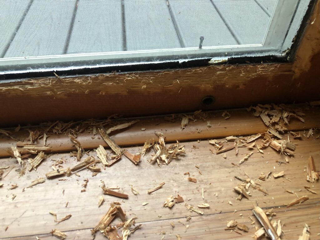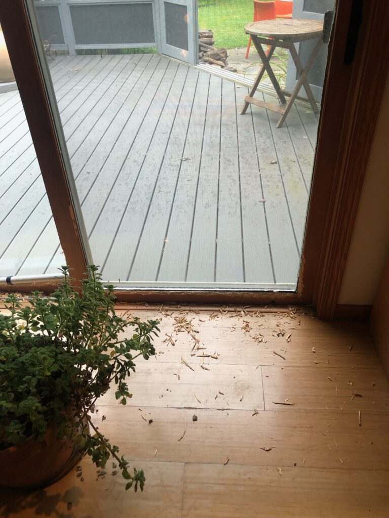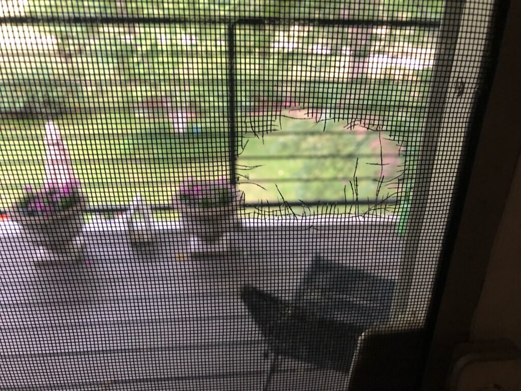 Madison’s finest arrived promptly and searched the house. No burglar was found cowering in a closet. However, the frame on her patio door was chewed to ribbons and a large hole was gnawed through the screen of an open upstairs window.
